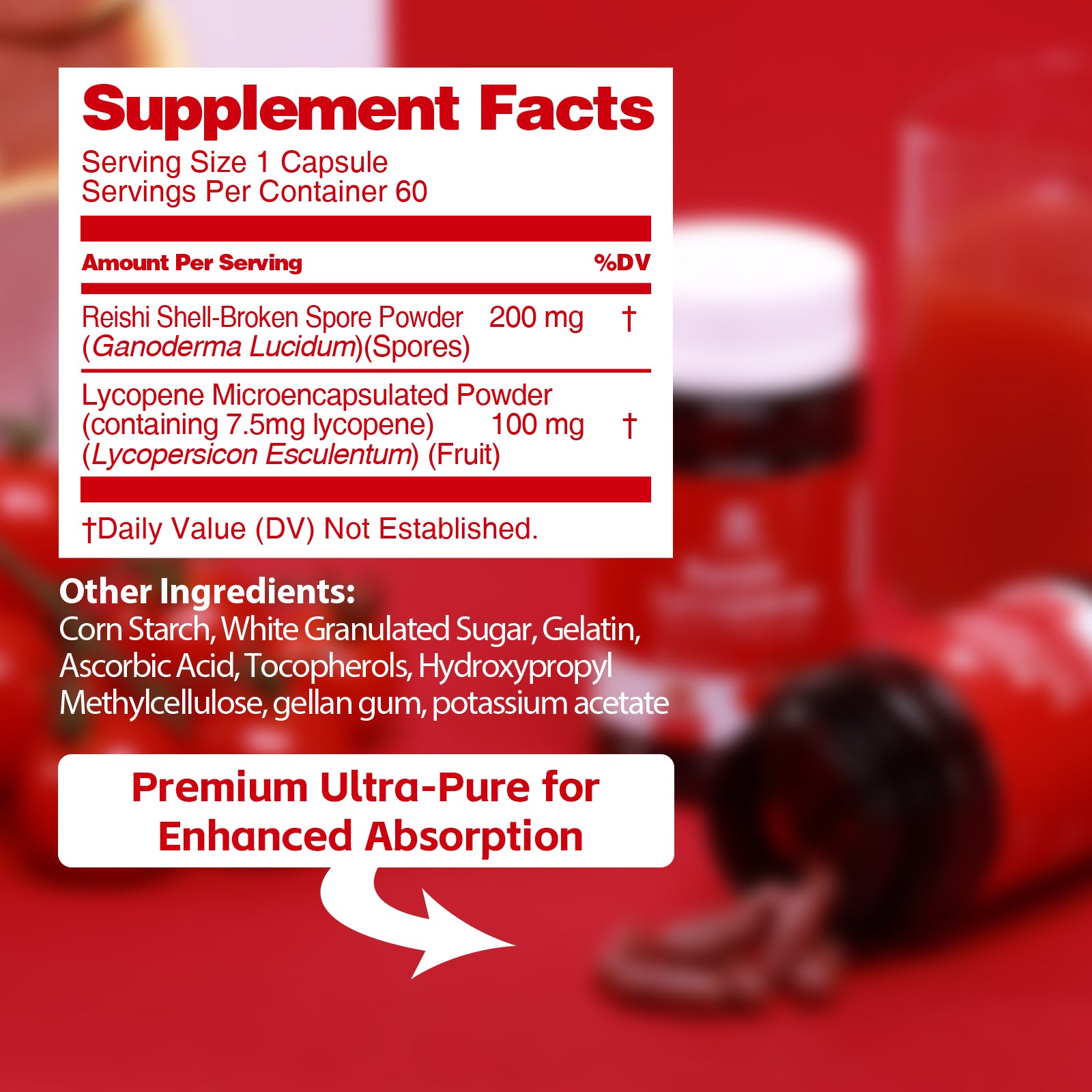 MAX STRENGTH LYCOPENE SUPPLEMENT: Our lycopene capsule delivers 100 mg of Lycopene supplement per serving in one convenient quick-release capsule. LYCOPENE BENEFITS: Our Lycopene supplement was sourced from natural tomato fruits, providing essential support for overall wellness and physical balance. RICHEST ORGANIC REISHI GANODERMA: Lycopene capsules typically contain 200mg organic reishi mushroom, along with lycopene to improve immune health and skin health. ONE-CAPSULE PER DAY: Take 1 capsule daily with meals, our lycopene supplement provides a convenient way to support your daily health care. QUALITY ASSURED: Our Lycopene capsules are manufactured in sterile labs under strict GMP standards and are free fillers or other artificial ingredients. This product is not intended to diagnose, treat, cure, or prevent any disease. These statements have not been evaluated by the Food and Drug Administration.